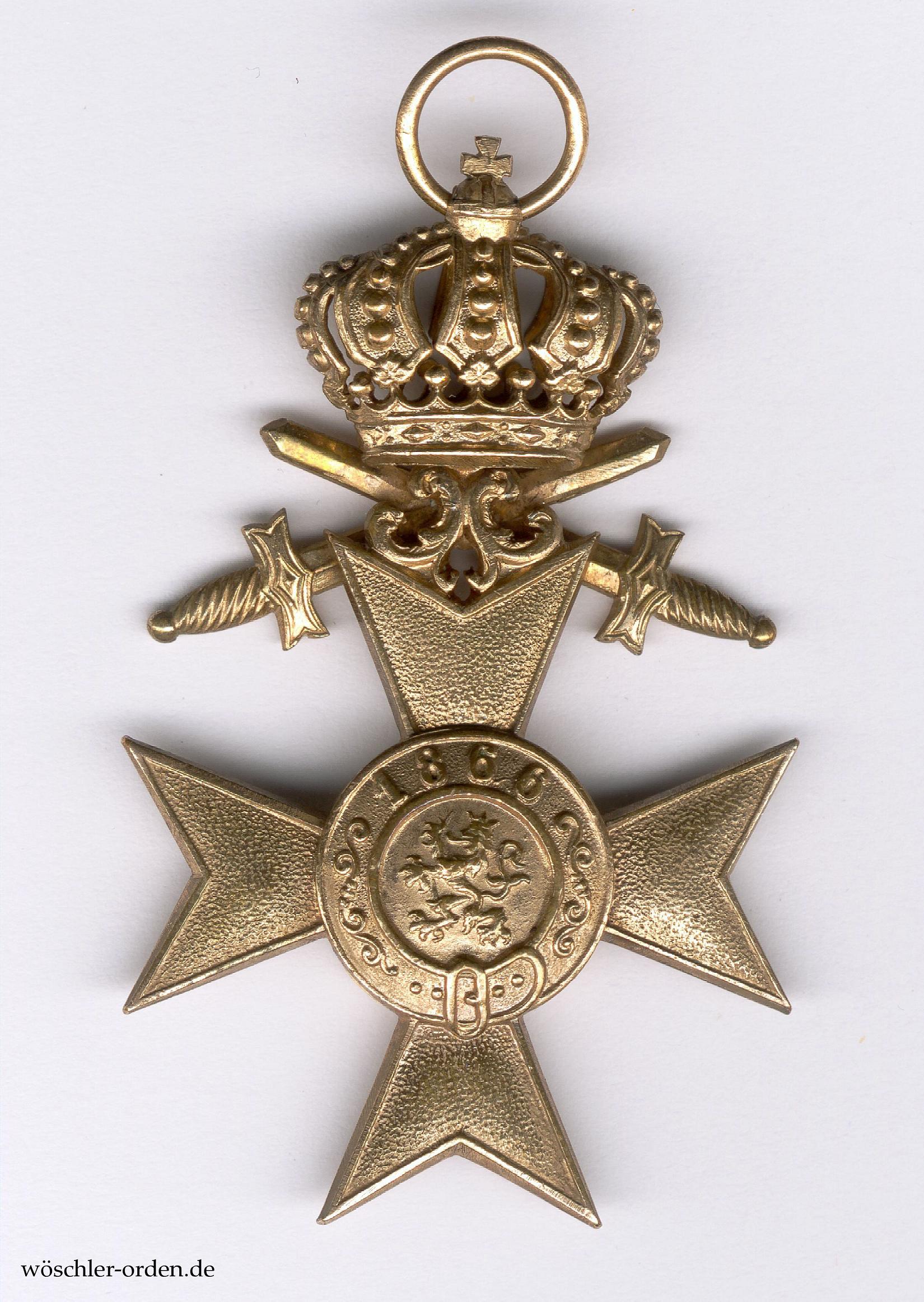 Wohl etwas spätere Zweitfertigung mutmaßlich aus Fertigung der Firma Gebrüder Hemmerle, München. Der Kreuzkorpus Buntmetall, mehrteilig gefertigt und vergoldet, die Schwerter starr verlötet und die Krone beweglich verstiftet. Beide Medaillons separat gefertigt und scheinbar verstiftet, das der Vorderseite mehrteilig in Gold (!) gearbeitet und emailliert.