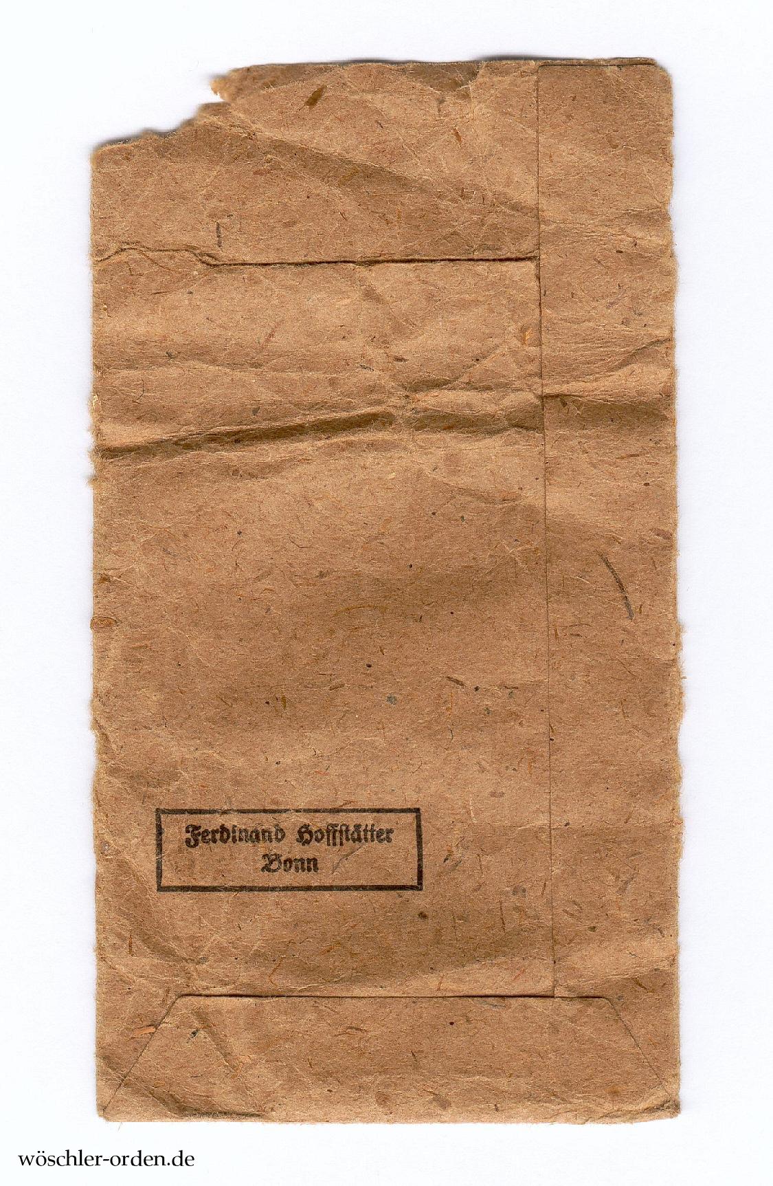 Leere Verleihungstüte („Zellstoffbeutel“), vorderseitig mit vierzeiligem Aufdruck „Kriegs- / Verdienstkreuz / 2. Klasse / ohne Schwerter“ sowie zweizeiliger Herstellerangabe „Ferdinand Hoffstätter / Bonn“ auf der Rückseite.