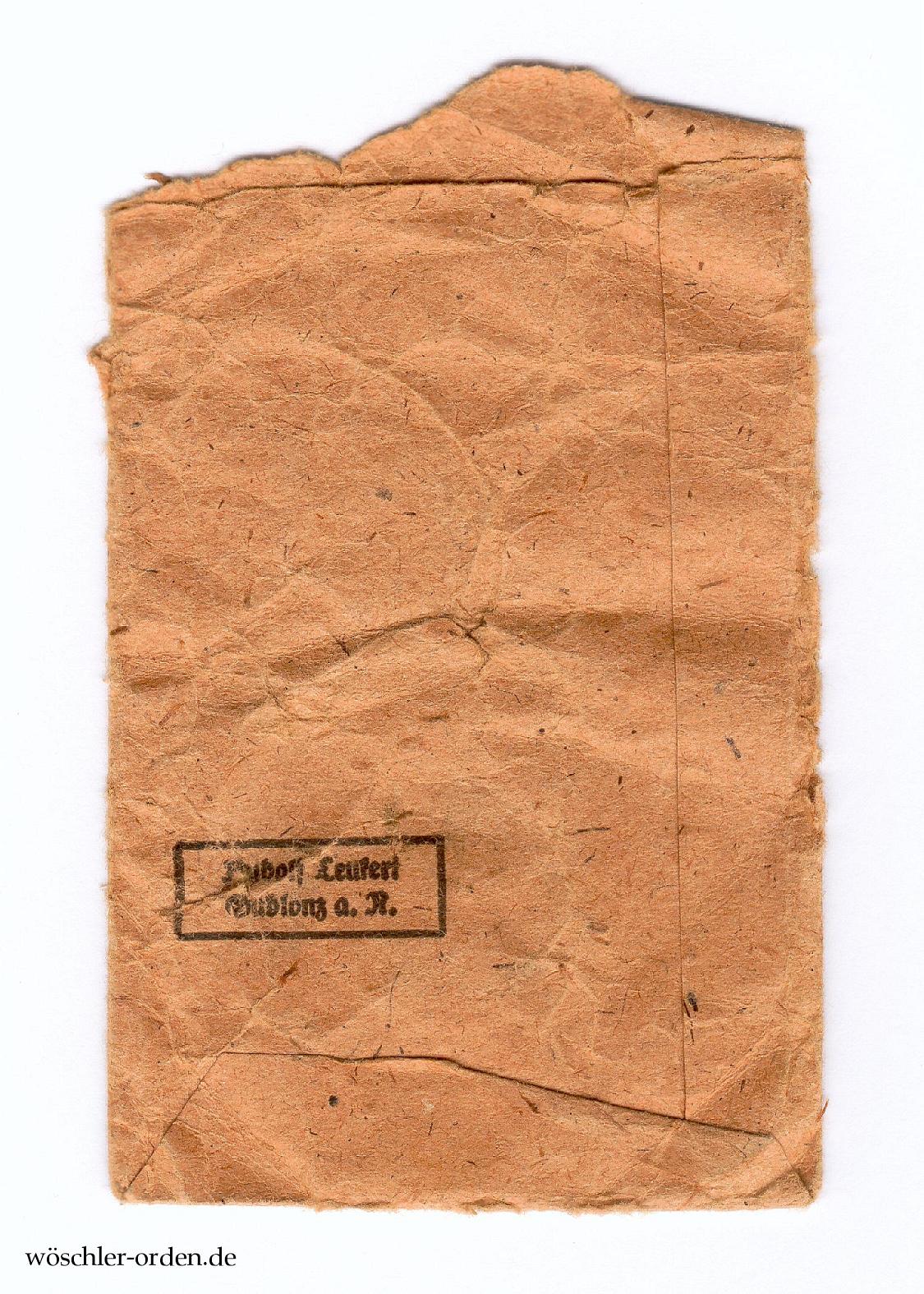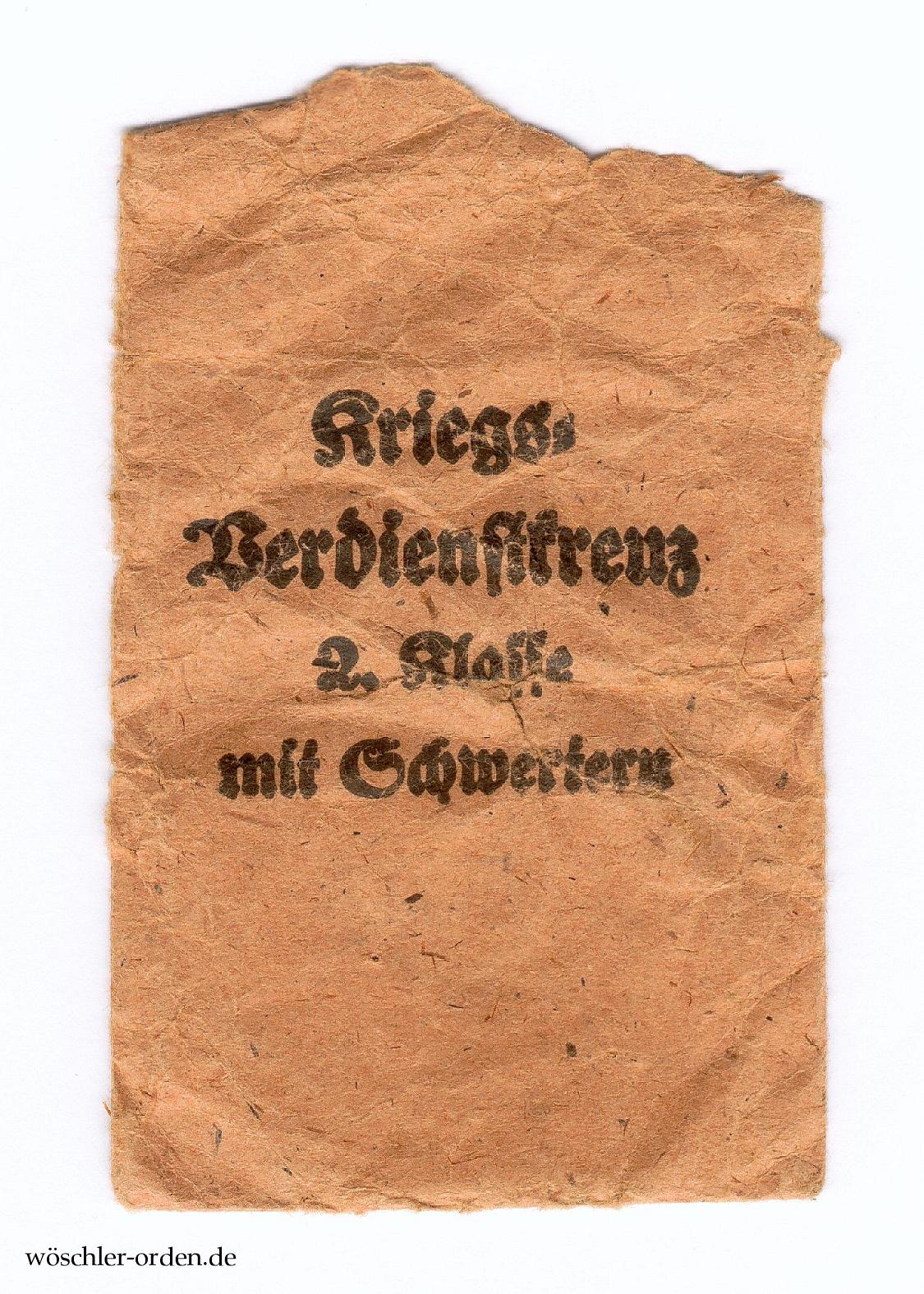 Leere Verleihungstüte („Zellstoffbeutel“), vorderseitig mit vierzeiligem Aufdruck „Kriegs- / Verdienstkreuz / 2. Klasse / mit Schwertern“ sowie zweizeiliger Herstellerangabe „Rudolf Leukert / Gablonz a. N.“ auf der Rückseite.