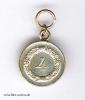 Miniatur, etwa 15 mm, für das Kettchen. Buntmetall geprägt und versilbert, an parallel angelöteter kleiner Öse, durch diese zwei weitere Ringchen.