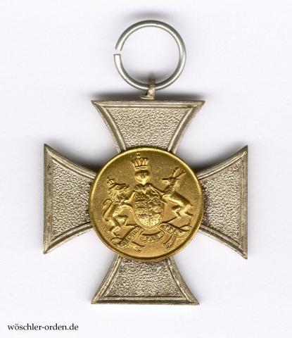 Weiß- oder Buntmetall geprägt und versilbert, die Vorderseite mit gekörnten Kreuzarmfelder, die Rückseite glatt. Mittig ein hohlgeprägtes, vergoldetes, kreisrundes Medaillon mit dem württembergischen Wappen aufgesplintet. An einfacher Ringöse mit einem offenen Bandring.
